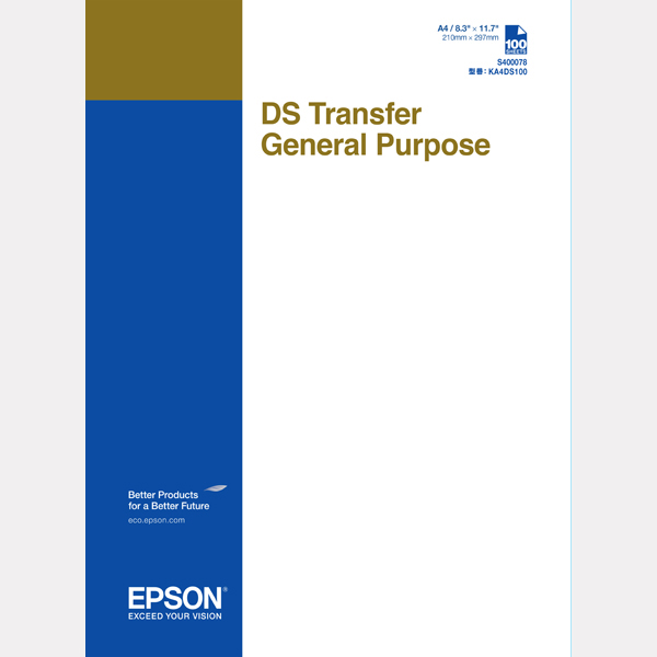 DS Transfer General Purpose Paper razvijen je za dekorativni prijenos tinte na tvrde podloge i tekstile na bazi poliestera. Kompatibilan je s tintama Epson UltraChrome DS i razvijen za upotrebu s pisačima SureColor SC-F500 i SC-F100.