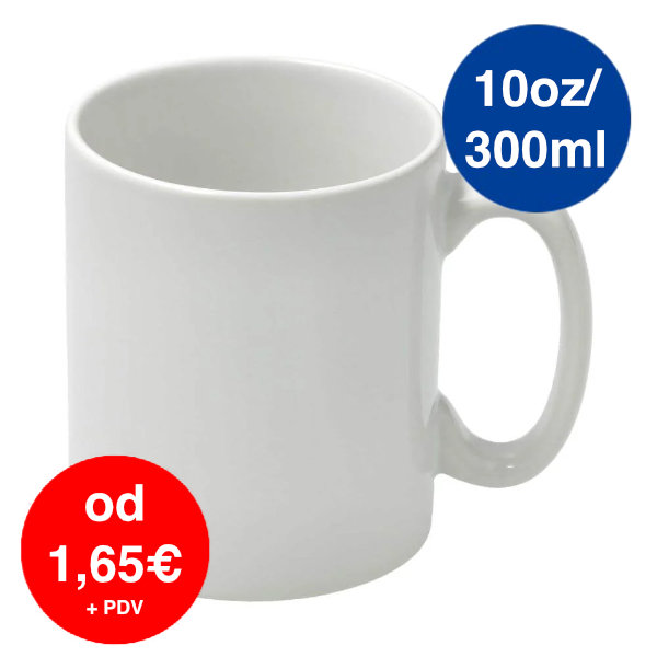 Bijela keramička šalica kapaciteta 10oz / 300 ml s prozirnim polimernim premazom idealna je za personalizaciju pomoću sublimacije. Premaz omogućuje jasan i trajan ispis fotografija, logotipa ili teksta.