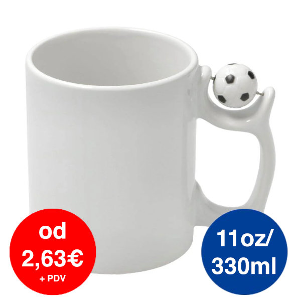 Šalica za sublimaciju 11 oz / 330 ml – bijela, ručka u obliku nogometne lopte